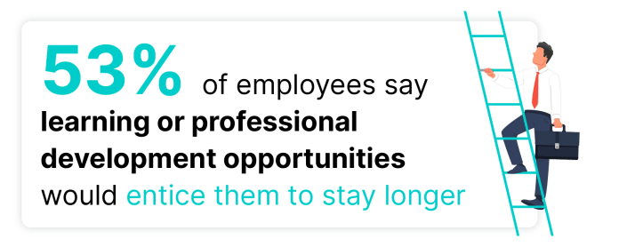 The modern workforce values growth, career advancement, and purpose. A great way to prevent turnover is by giving employees opportunities for growth and development. Many people leave their jobs because they don’t see professional or career development opportunities at the place they work. Make it a priority to invest in your employees by encouraging long-term goal setting, providing coaching and mentorship, and leveraging internal hires when possible. When you encourage your team to continuously learn and grow, you’ll reduce the risk of turnover and increase employee retention.